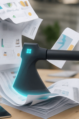 Animate a dramatic motion scene of a sleek, modern axe with a glowing blue edge (resembling a tech logo) striking into a stack of printed charts and documents on a wooden desk. As the axe hits, papers burst upward in slow motion, swirling through the air with realistic physics and light motion blur. The background remains softly blurred, keeping focus on the motion of flying papers and glowing axe. The camera slightly tracks the motion, adding a cinematic parallax effect. The lighting should emphasize the cool blue glow of the axe and the paper reflections. Use realistic dynamics, 3D depth, and looping capability (~5–7 seconds). Maintain professional, tech-commercial visual style.Add a Sora2 node: