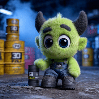 3D render of an adorable small green furry monster toy sitting on a dusty workshop floor. The monster has soft fluffy lime-green fur, two short dark horns, big round glossy eyes, and a cute expressive face with small eyebrows. It’s wearing slightly worn blue denim overalls and heavy black work boots.