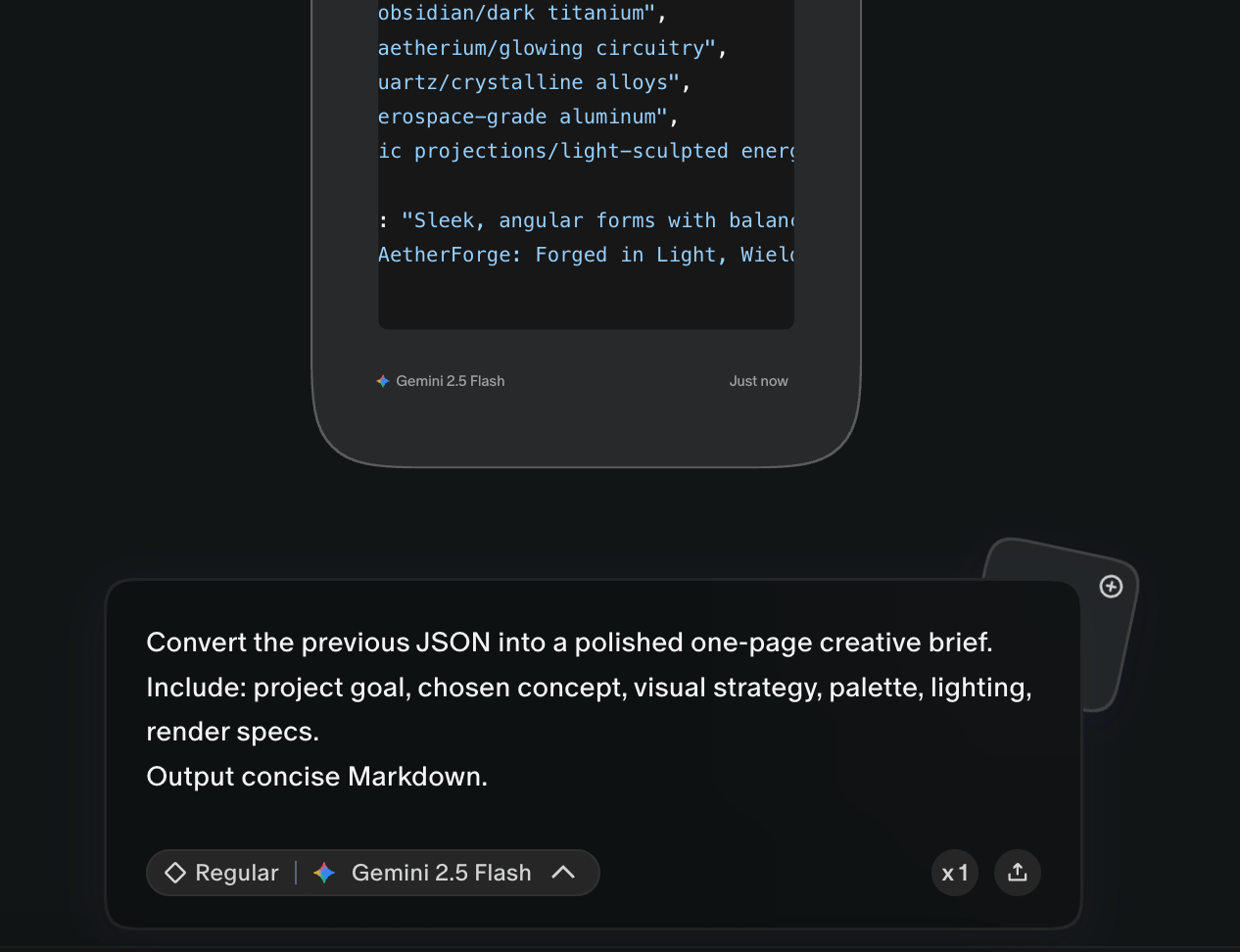 Return JSON: concepts[], palette, materials[], silhouette, tagline.Connect your inputs to this node.