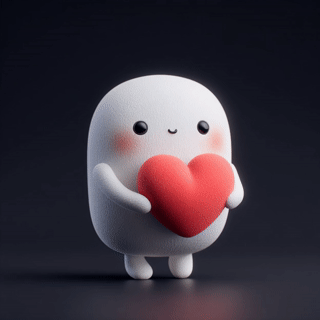 3D render of an adorable round white character with a smooth matte texture, tiny arms and legs, blushing cheeks, and a happy face holding a bright red heart in its hands. The scene is softly lit with a dark gradient background, creating a cozy, minimal, and emotional mood.