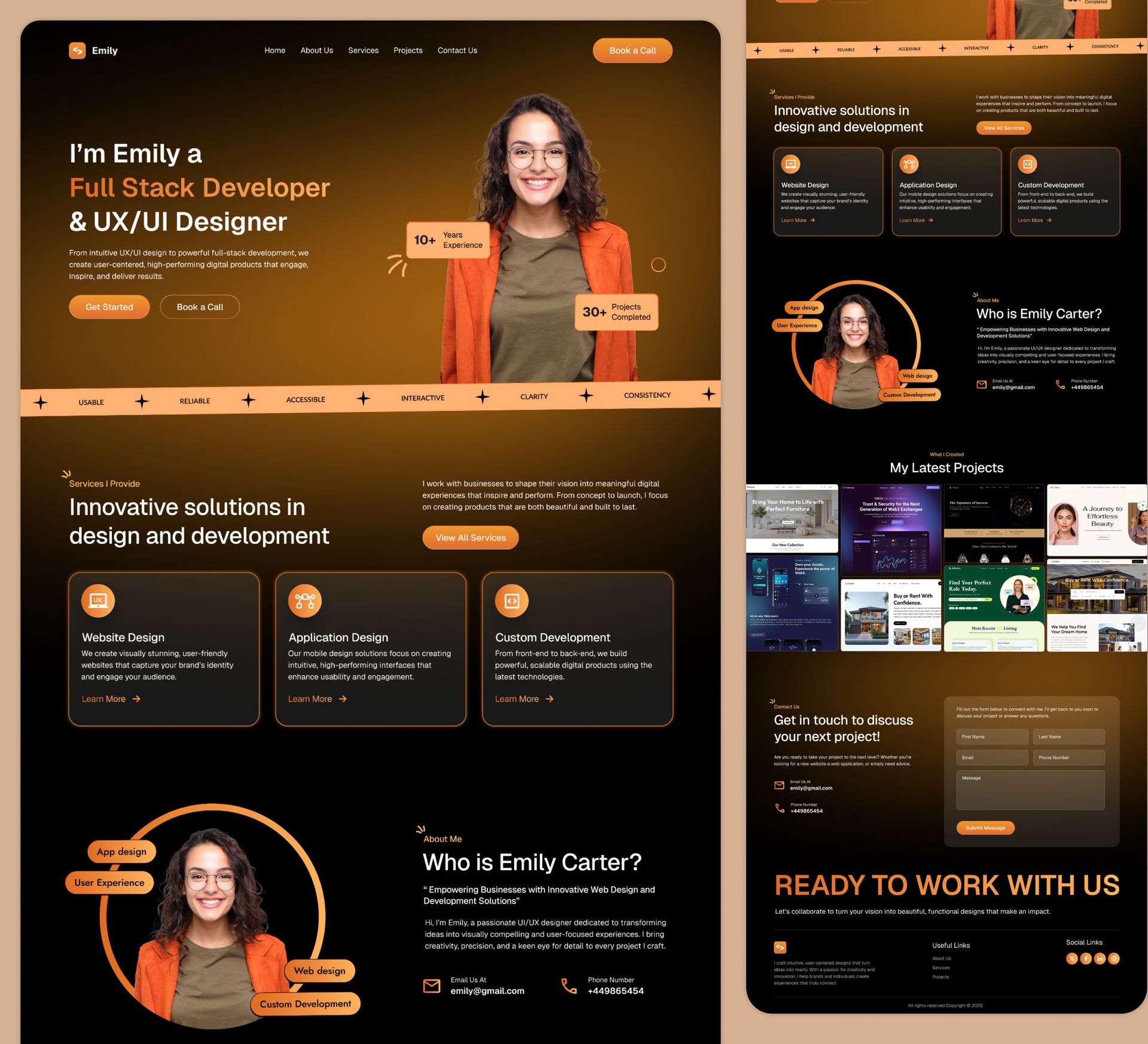 Create a warm, modern portfolio for Emily Carter, Full Stack Developer and UX/UI Designer, using Trickle.so portfolio generator. Use dark brown and orange tones, clean typography, and strong hierarchy. Hero section: gradient background from dark brown (#1B1B1B) to warm orange (#F07B1F), portrait on the right with soft lighting, large centered text “I’m Emily, a Full Stack Developer & UX/UI Designer,” short paragraph “From UX strategy to full-stack development, I create engaging, high-performing digital products,” and two buttons: “Get Started” (solid orange) and “Book a Call” (outline white). Top nav: logo “Emily” left, menu (Home, About, Services, Projects, Contact), rightmost button “Book a Call” (orange). Below hero: thin divider bar listing design principles (Usable, Reliable, Interactive, Clarity, Consistency) in small uppercase with light animation. Services section: title “Innovative Solutions in Design and Development,” subtext “Transforming ideas into meaningful digital experiences that inspire and perform,” button “View All Services.” Three service cards in row (Website Design, Application Design, Custom Development) with dark gray backgrounds, orange icons, and “Learn More” links. About section: left circular photo with orange ring, right text “Who is Emily Carter?” paragraph “Empowering businesses with innovative web design and development solutions,” short bio “I’m a UX/UI designer helping brands grow through clean, functional design,” and contact info (email, phone, social icons). Projects section: title “My Latest Projects,” grid of 6–8 thumbnails with hover zoom and drop shadow, each linking to details or case studies. Contact section: headline “Get in Touch to Discuss Your Next Project,” short intro line, form fields (name, email, message), orange “Send Message” button, and bold footer line “READY TO WORK WITH US.” Footer: black background, small logo “Emily Carter,” links (About, Services, Projects, Contact), and social icons (LinkedIn, Behance, Dribbble) with orange hover. Styling: font Poppins or Satoshi, background #1B1B1B, text #FFFFFF, accent #F07B1F, generous spacing, smooth scroll transitions, fully responsive. Meta title “Emily Carter | Full Stack Developer & UX/UI Designer,” description “Designing and developing intuitive digital experiences that combine usability and performance.” Single-page layout optimized for Trickle export.