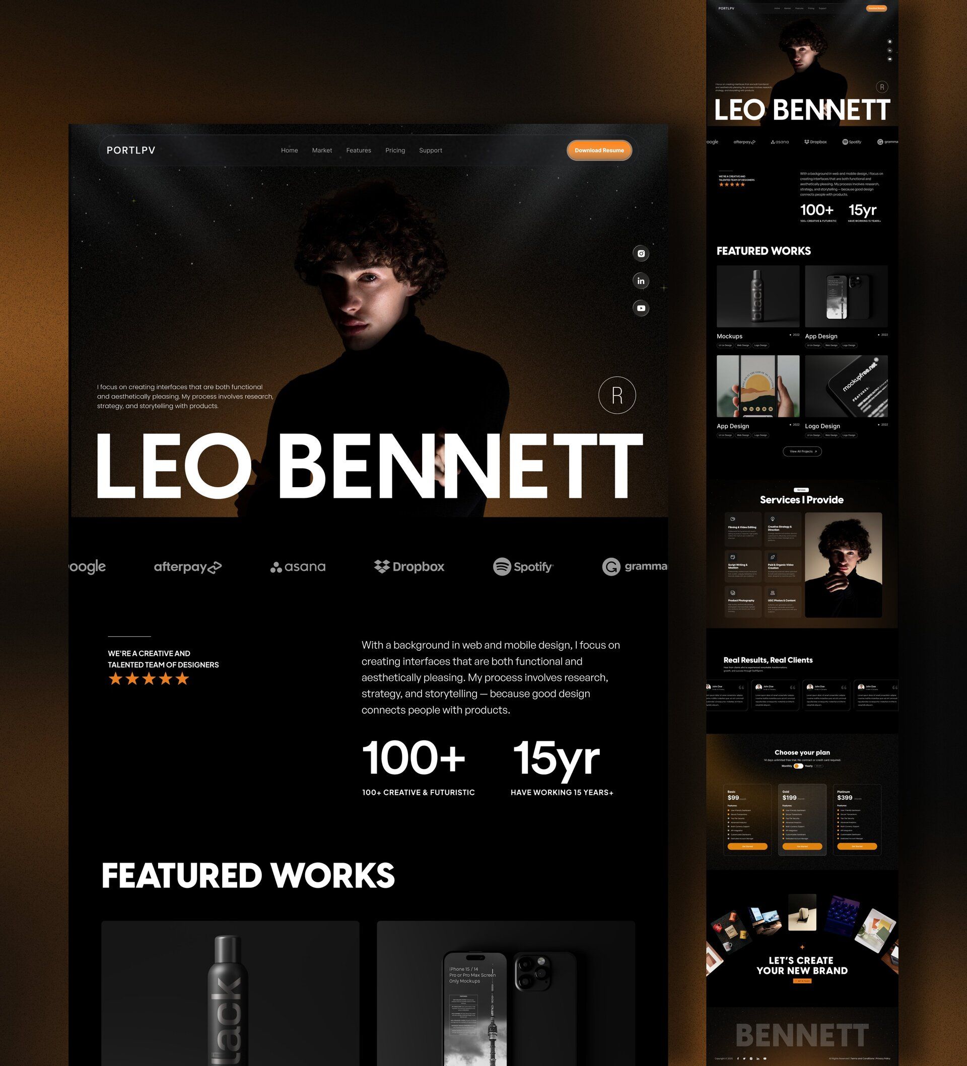 Create a dark, cinematic personal portfolio for digital designer Leo Bennett using Adobe Express portfolio maker. Use black and bronze tones with bold white typography and orange accents. Hero section: full-width gradient from black to bronze, portrait spotlight, large centered text “LEO BENNETT” in all caps white, subtitle “I create interfaces that are both functional and visually striking.” Buttons: “View My Work” and “Download Resume” (orange with hover glow). Navigation bar: Home, Market, Features, Pricing, Support, right-aligned orange button “Download Resume,” logo top-left “PORTILPV.” Below hero, grayscale brand logos (Google, Afterpay, Asana, Dropbox, Spotify, Grammarly) in a horizontal row. About section: left badge “Creative & Talented Team ★★★★★”, right text “With a background in web and mobile design, I focus on functional, aesthetic interfaces built through research, strategy, and storytelling.” Stats: “100+ Projects” and “15yr Experience.” Featured Works: 4 cards (Mockups, App Design, Product Visualization, Logo Design) with dark backgrounds, white text, hover zoom. Services: 3 cards (Web Design, App Design, Branding & Visual Identity) with black-to-brown gradient and small icons; include a small profile image of Leo overlapping the section. Testimonials: title “Real Results, Real Clients,” three short client quotes with gray portraits and orange stars. Pricing: title “Choose Your Plan,” three cards (Basic, Standard, Premium) with white prices, orange “Get Started” buttons, and short descriptions. CTA: headline “Let’s Create Your New Brand,” short text inviting collaboration, orange “Start Your Project” button. Footer: black background, large gray “BENNETT” text, links (About, Services, Portfolio, Contact), white social icons (LinkedIn, Dribbble, Instagram) with orange hover. Style: font Montserrat or Space Grotesk, background #0B0B0C, text #FFFFFF, accent #FF7B2C, secondary bronze #9C6433. Use subtle motion fade-ins, consistent alignment, and mobile responsiveness. Meta title “Leo Bennett | Designer & Brand Architect,” description “Experienced digital designer crafting high-impact, story-driven visuals and interfaces.” Single-page structure optimized for Adobe Express export.