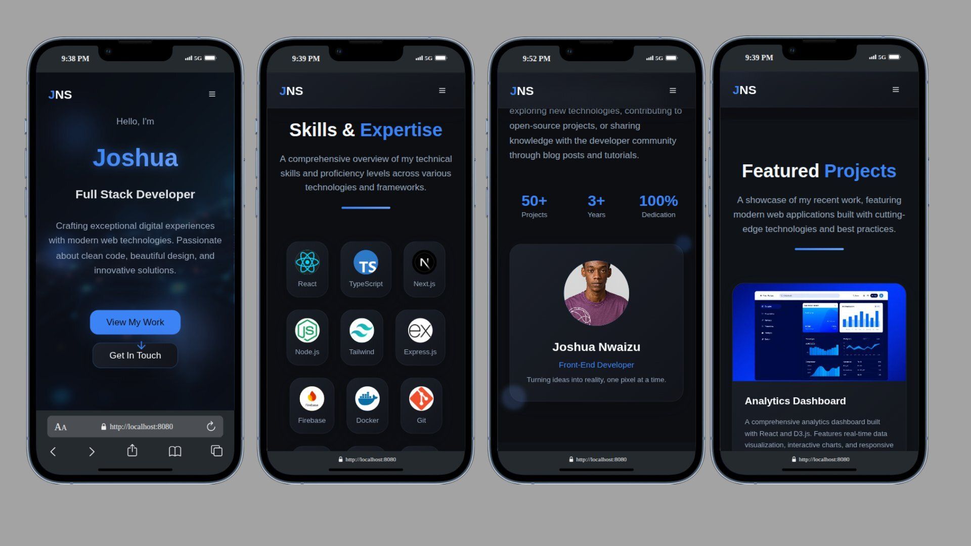 Create a modern dark-theme personal portfolio for a Full Stack Developer named Joshua Nwaizu using neon blue accents and mobile-first design.
