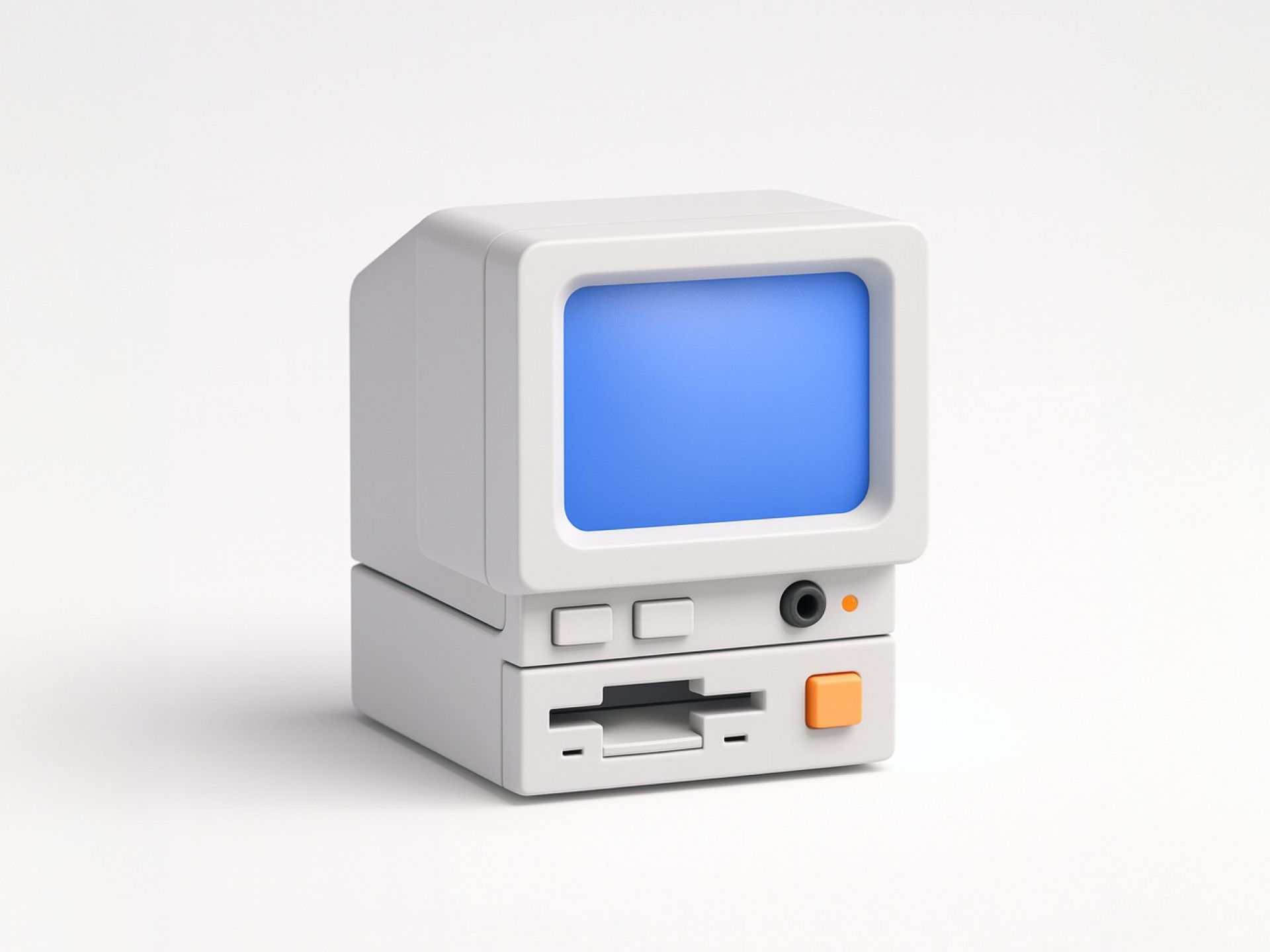A small, minimalist 3D render of a retro desktop computer inspired by 1980s designs, featuring a compact CRT-style monitor with a soft glowing blue screen. The computer has a simple, geometric, toy-like form with smooth white plastic casing and rounded edges. Below the screen is a floppy disk slot, a few small buttons, and one orange accent button. The design is clean, modern, and symmetrical. The background is a plain, soft white or light gray studio backdrop with diffused lighting. The style is photorealistic yet stylized, evoking high-end product renders and Apple-like simplicity. No text, no logos, no cables. Rendered with soft global illumination, subtle reflections, and smooth shadow gradients.Wrapping Up